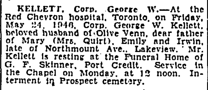 Son of Emily Kellett, of Lakeview, Ontario. Husband of Olive M. Kellett, of Lakeview, Ontario.