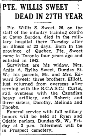 Son of Mr. and Mrs. Edward Sweet, of Westville, Nova Scotia, husband of Anita A. Sweet, of Toronto.