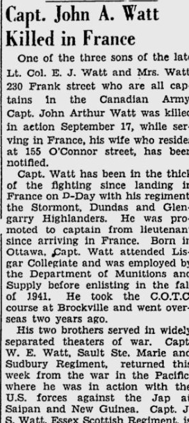 Brother of Captain James Stewart Watt, who died on October 21, 1944, while serving with the Essex Scottish Regiment.