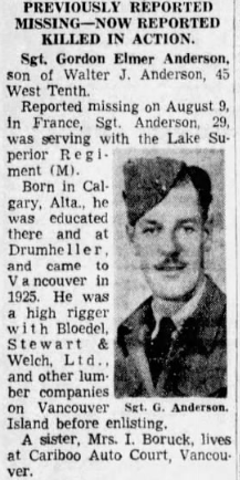 Sergeant Gordon Elmer Anderson is also commemorated on the Lake Superior Regiment (Motor) Memorial located in Hillcrest Park, Thunder Bay, ON … May 2018 ... photo courtesy of Marg Liessens -
