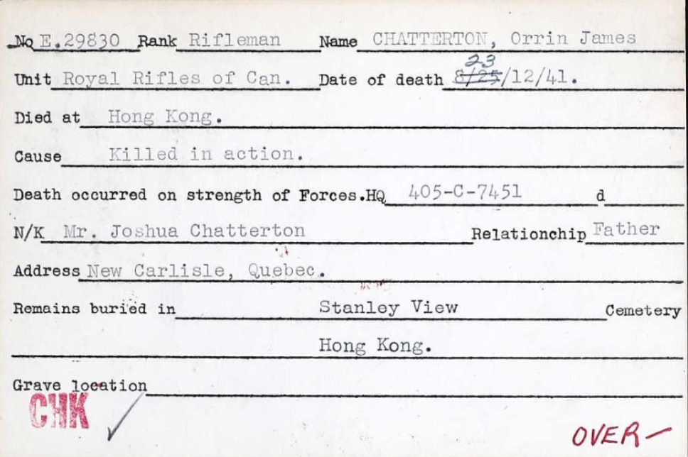He served in Québec, New Brunswick, and Newfoundland with Force W, and in Hong Kong with Force C. He had 527 days of service, including 59 overseas.