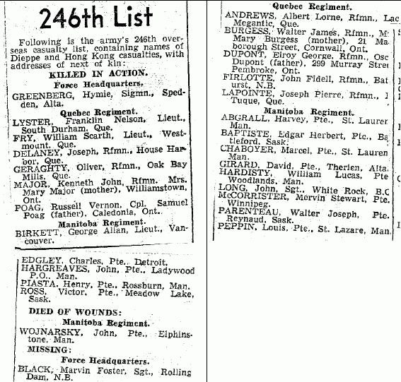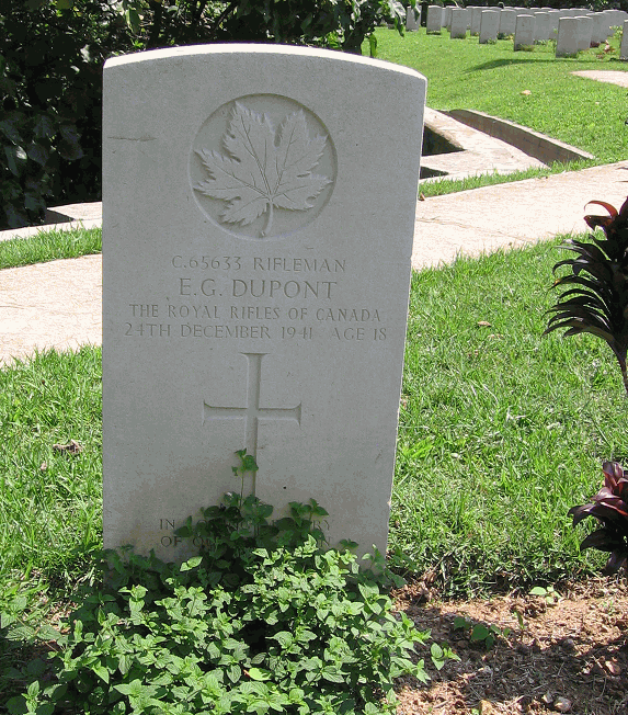 Enrolled in the 1st Midland Regiment, served in Ontario and New Brunswick, transferred to the 1st Battalion Royal Rifles of Canada on October 19th, 1941, served in Québec, Hong Kong with C Force.