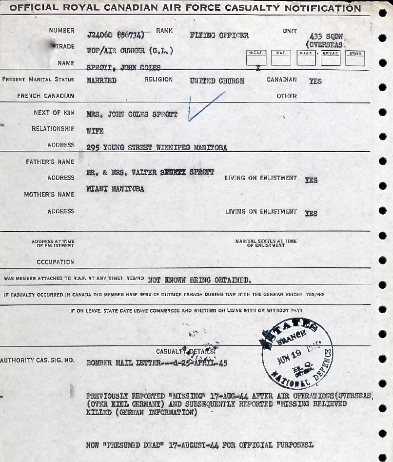 Brother of Leading Aircraftman Ronald Gear Sprott, who died on August 3, 1942, while serving with the Royal Canadian Air Force.