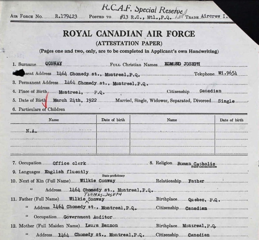 Son of Wilkie Thomas and Laura Bannon Conway of Montreal, Quebec.