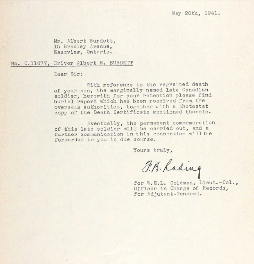 Son of Albert Edward and Daisy Burdett, of East View, Ontario, Canada.