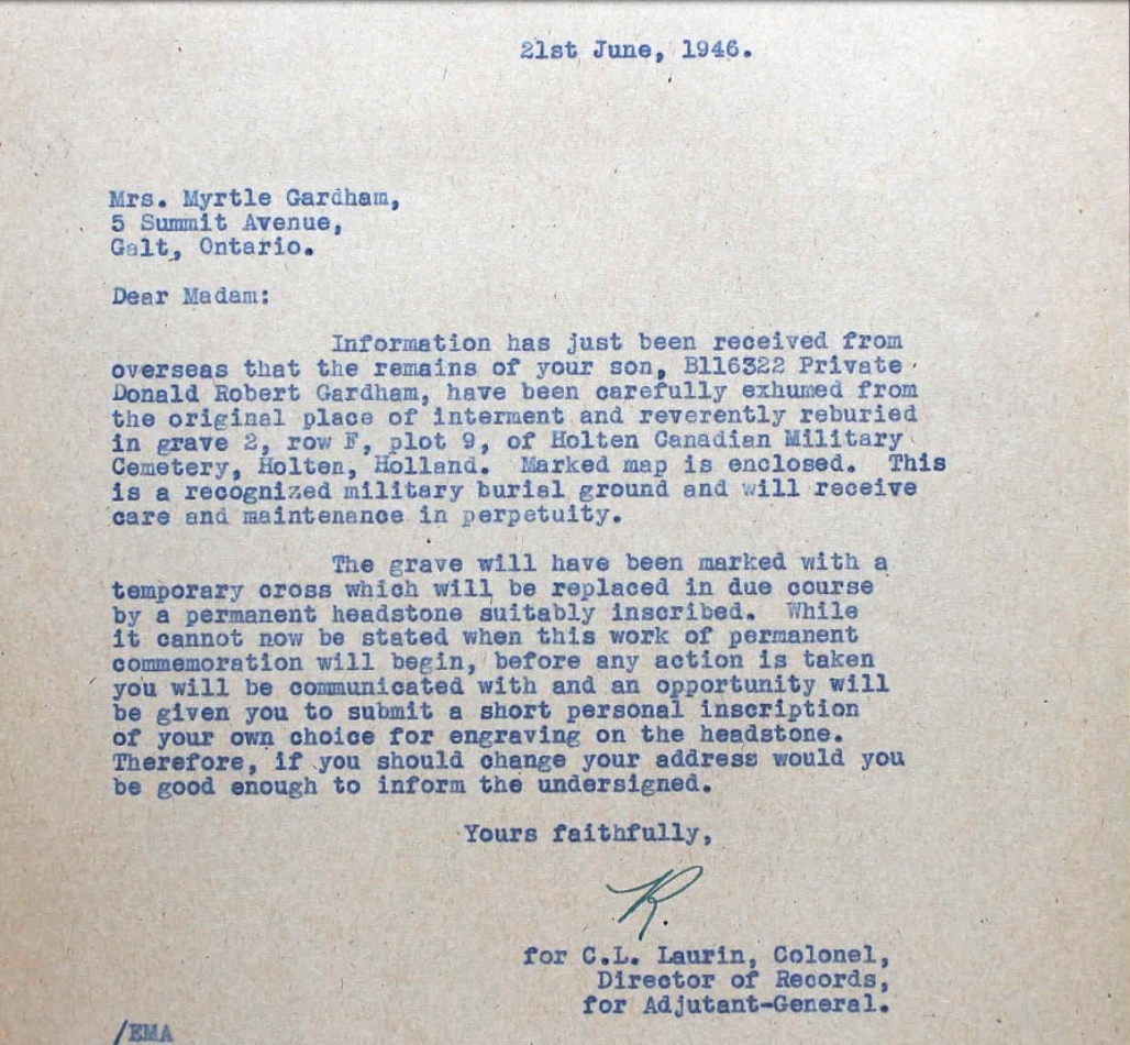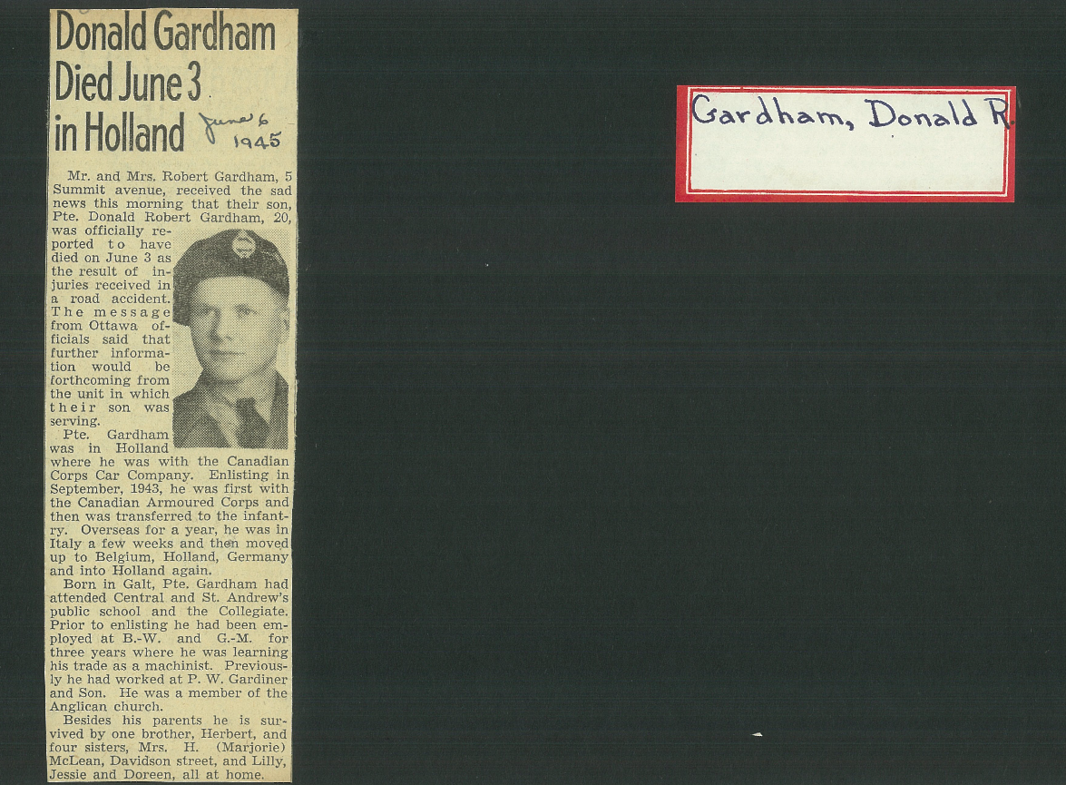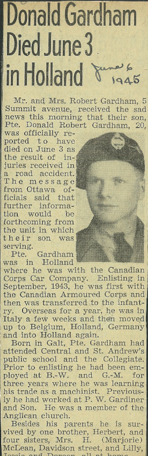 Son of Robert and Myrtle Alice Gardham, of Galt, Ontario.