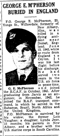 Son of George and Addie E. McPherson, of New Albany, husband of Lois Helen McPherson, of Northmount, Ontario.