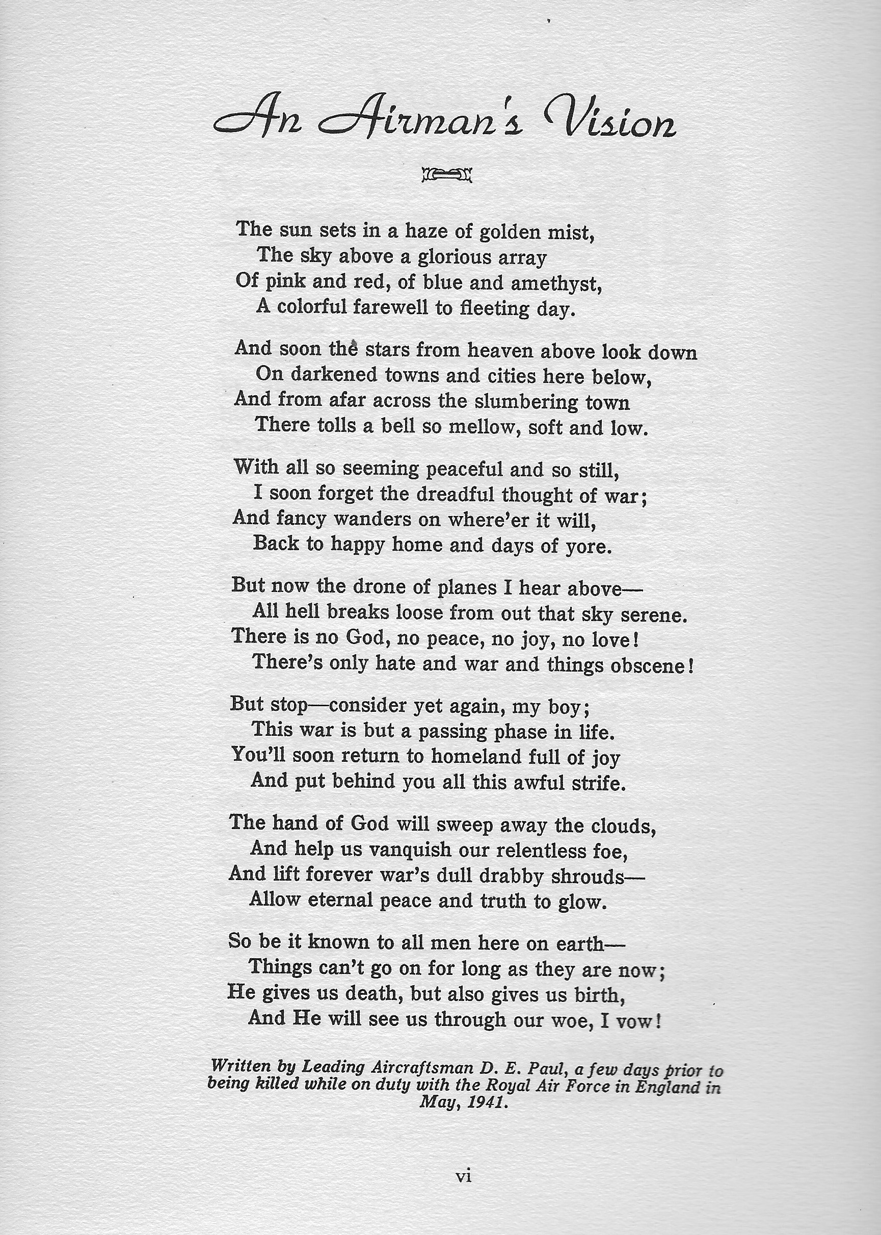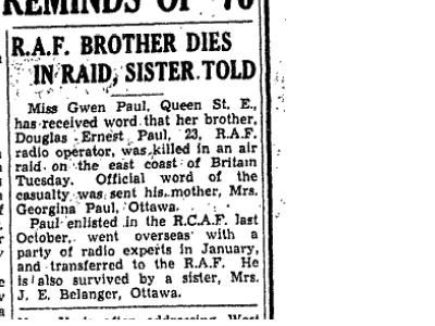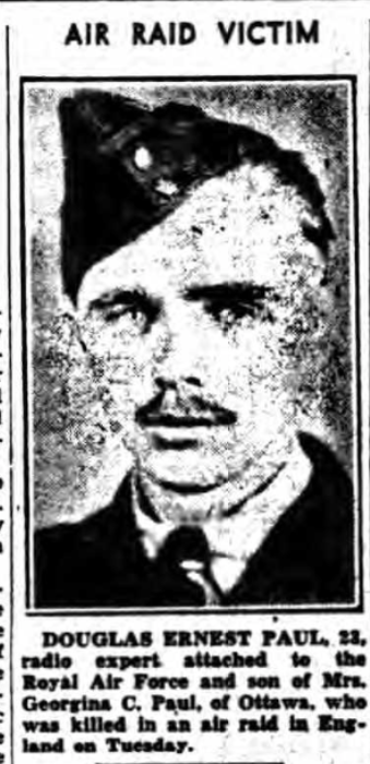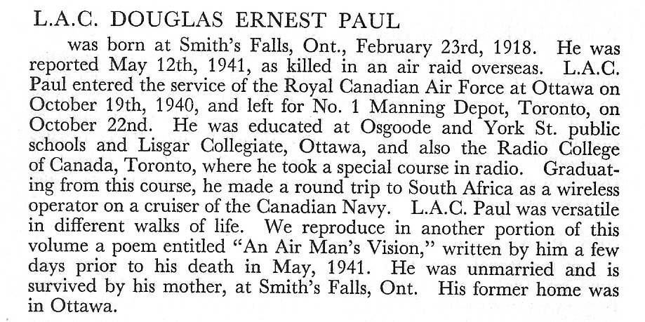 Son of W. J. Leslie Paul and of Georgina C. Paul (nee Van Exan), of Smiths Falls, Ontario, Canada.