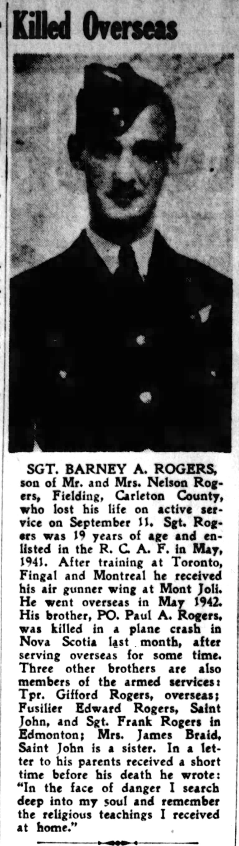 Son of Nelson Burt Rogers and Lottie Hazel (nee Gaunce) Rogers, of Fielding, New Brunswick.