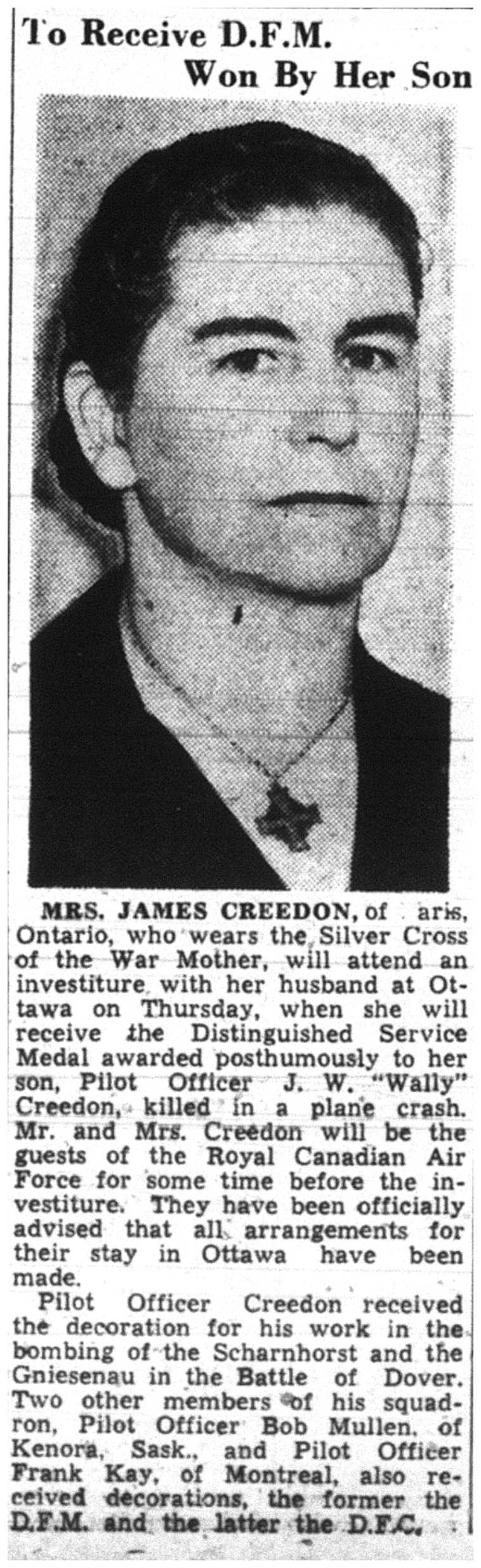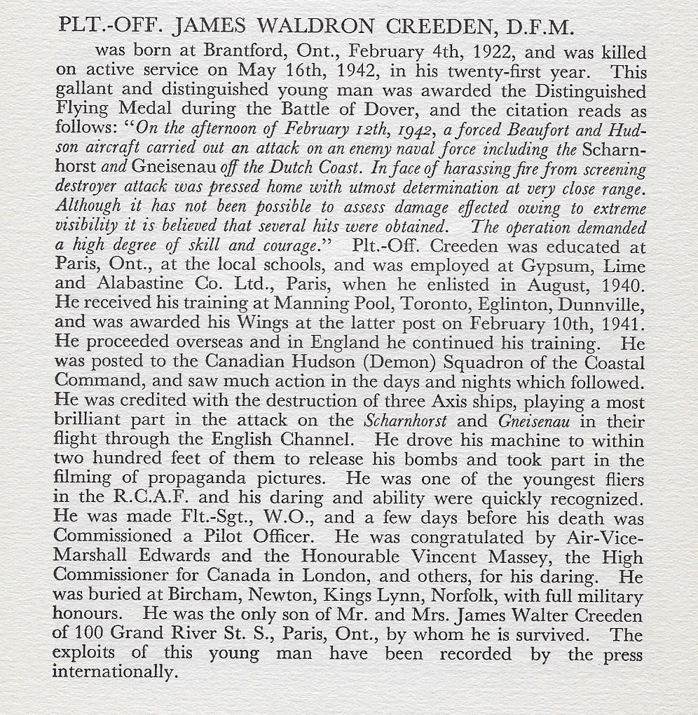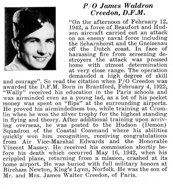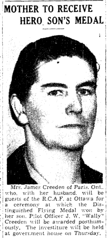 Pilot Officer James Waldron Creedon has been honoured by having Mount Creeden named after him. The location of is in Yukon (115H06- 61° 16’ 00”- 137° 15’ 19”)