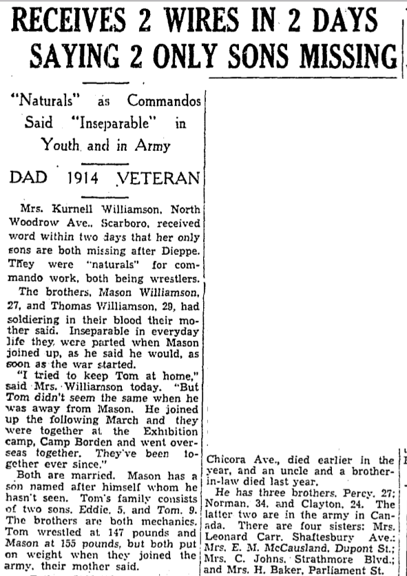 Son of Kurnell Mason Williamson and Flora Williamson, of Scarboro' Junction, Ontario; husband of Ethel Williamson, of Toronto, Ontario. His brother, Mason Lewis served in the same unit, died on the same day and is buried elsewhere in this cemetery.