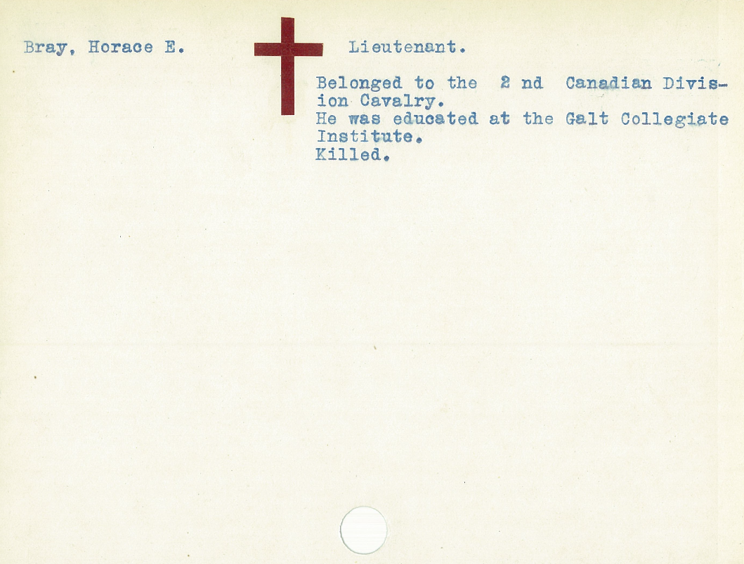Son of the Rev. Horace E. Bray, rector of Thamesford, Ontario, and Alice Maude Bray, High St., London, Ontario. Enlisted in 7th C.M.R., C.E.F., 1915.
