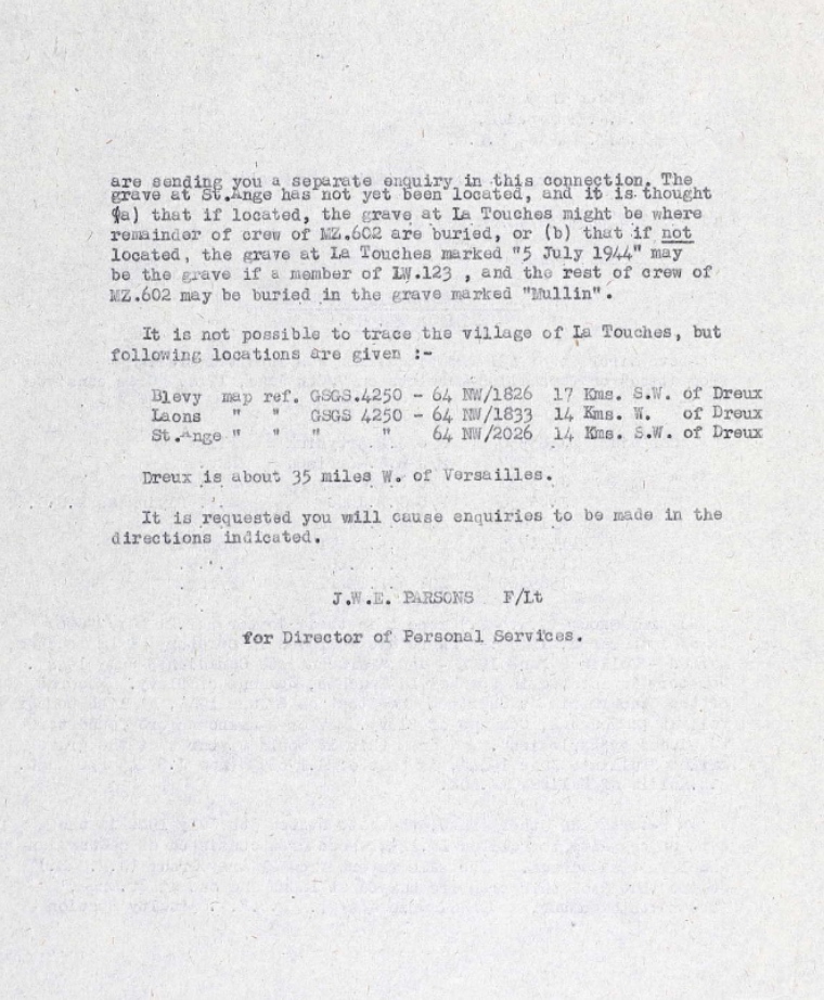 Blevy is a village and commune 32 kilometres north-west of Chartres and 18 kilometres south-west of Dreux. The most practical course is to take a taxi from Dreux. The cemetery is north of the village on the D.20 road from Dreux. Some 17 yards south of the crucifix in the centre of the cemetery is the collective grave of eight airmen. Three of them belonged to the Royal Air Force and five to the Royal Canadian Air Force.
