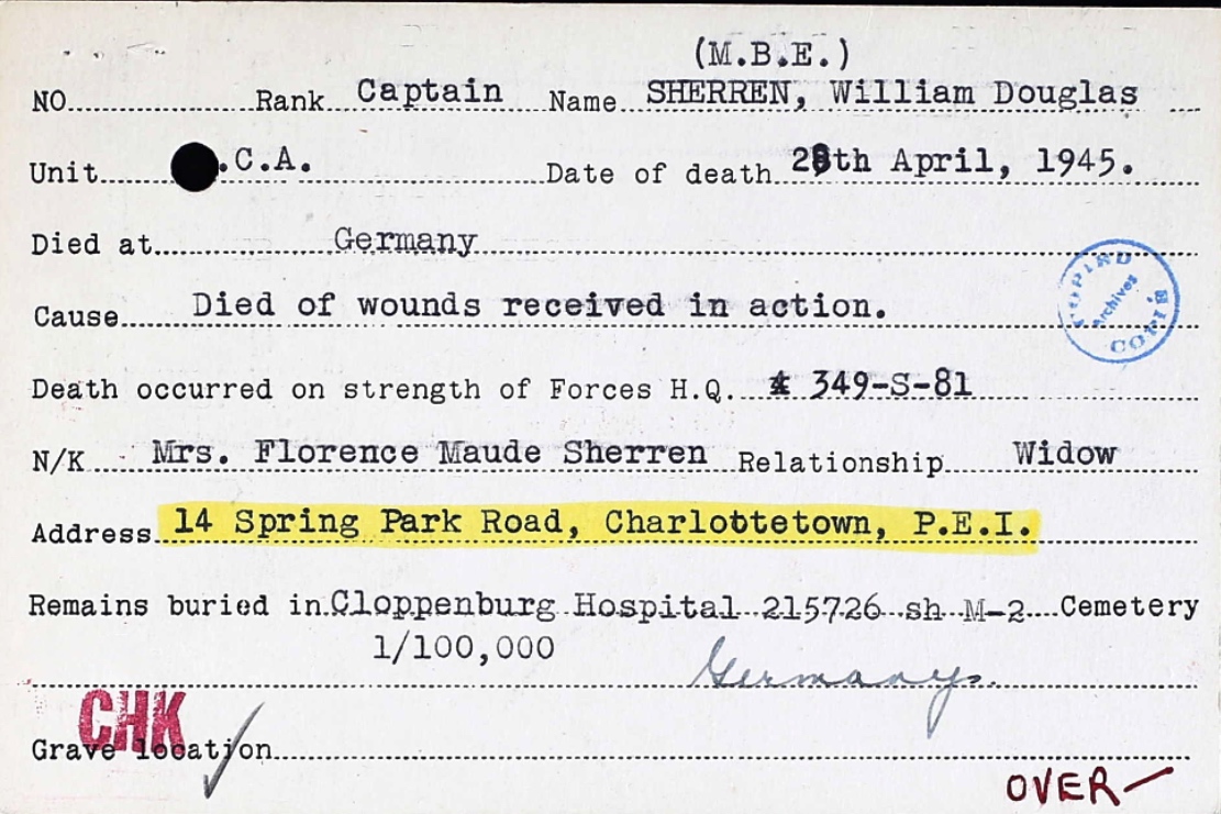 Son of Mr. and Mrs. W. D. Sherren; husband of Florence Maude Sherren, of Charlottetown, Prince Edward Island.