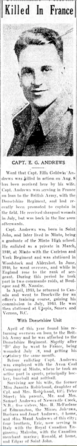Ellis G. Andrews was a member of the Royal Canadian Infantry Corps, he died while serving with the Dorsetshire Regiment as a CANLOAN Officer.