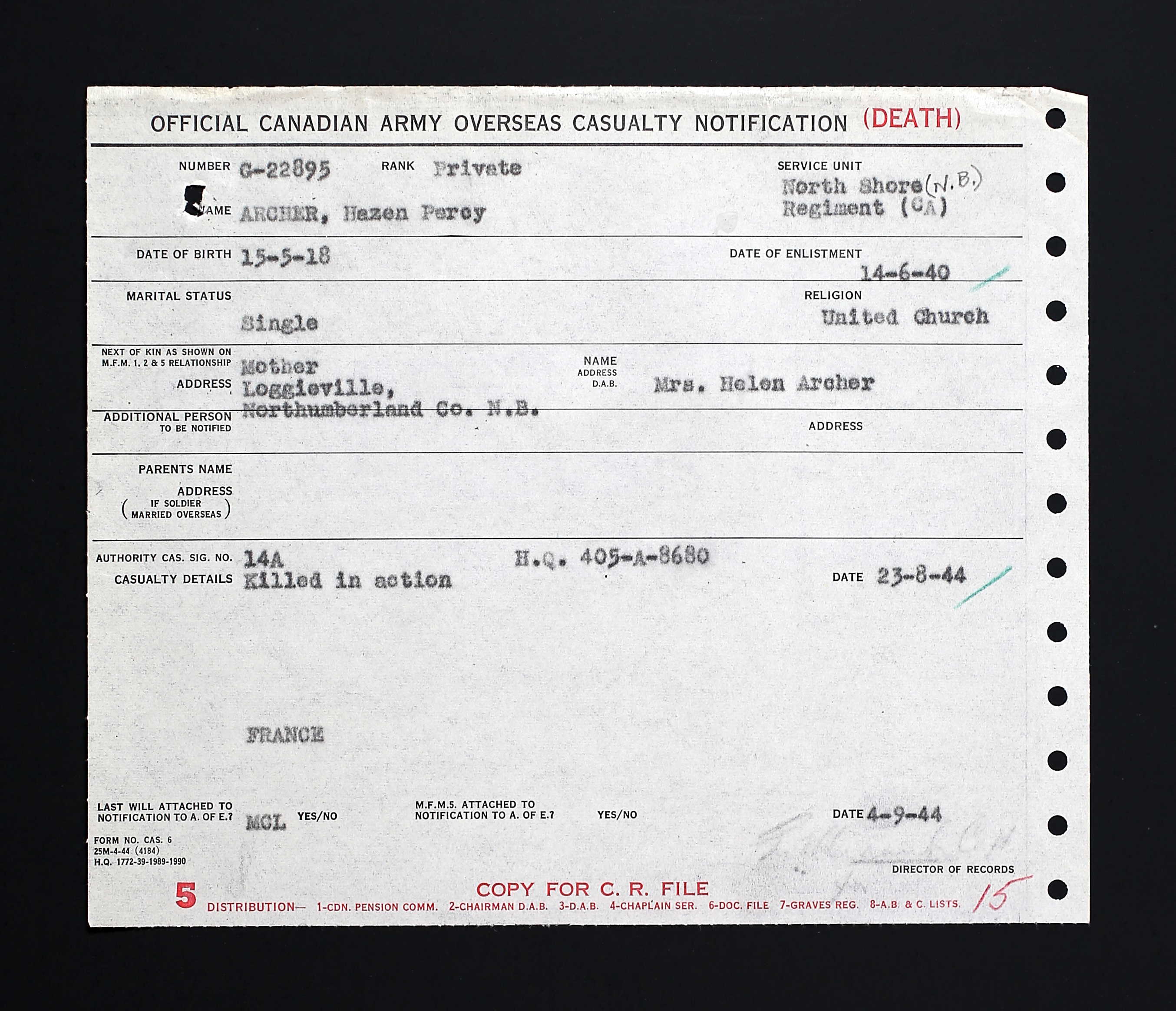 Son of William R. and Helen Archer, of Loggieville, Northumberland Co., New Brunswick.