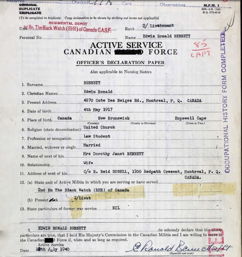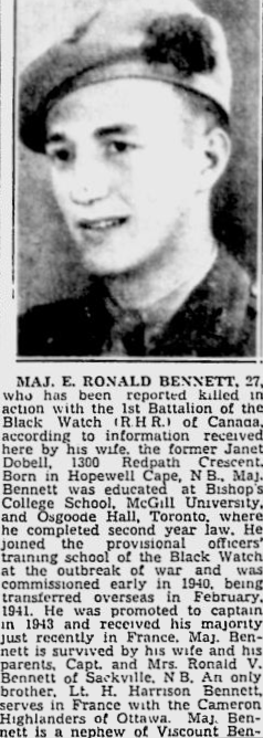 Son of Captain Ronald V. and Elva I. Bennett, of Sackville, New Brunswick. Husband of Dorothy Janet Bennett of Montreal, QC.