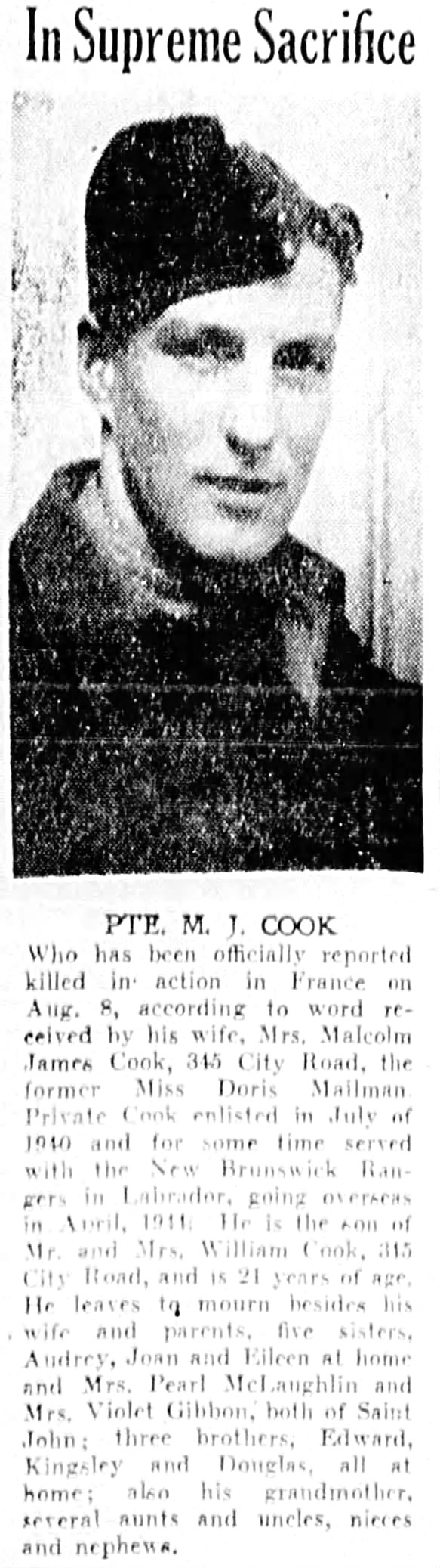 Son of William M. and Gertrude May Cook, of Saint John, New Brunswick; husband of Maud Doris Cook, of Saint John.
