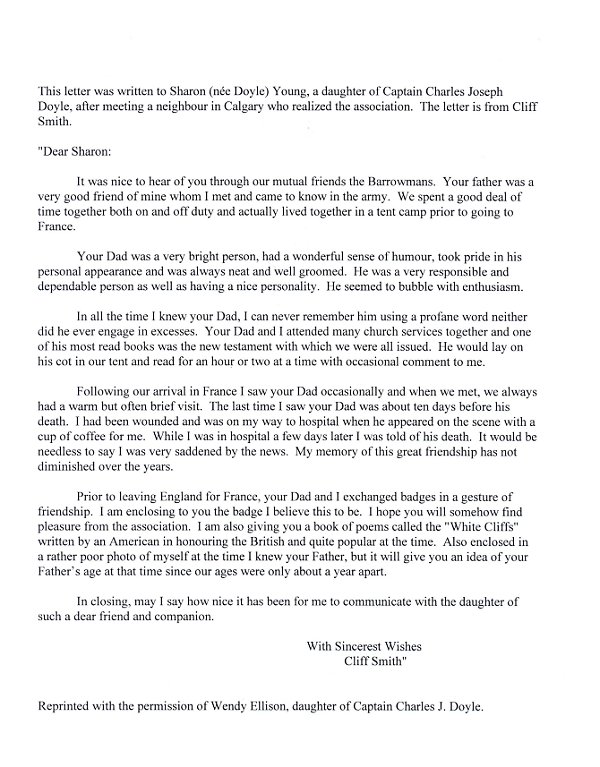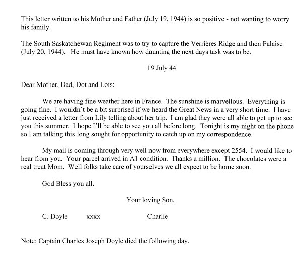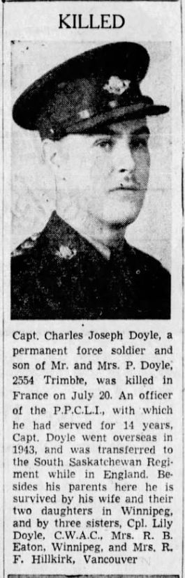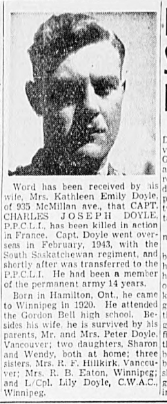 Son of Peter and Margaret (née Lunt) Doyle; husband of Kathleen Emily (née Hill) Doyle and father of Sharon Lynn and Gwendoline Joyce, of Winnipeg, Manitoba. Captain Doyle received his middle name 'Joseph' from a friend of his fathers'. They played in the same military band. Joseph was very kind to Peter and though not a wealthy man, gave him a substantial sum of money for the baby. Peter Doyle served with the Princess Patricia's Canadian Light Infantry in World War One, leaving shortly after Charles was born and returned in 1918. Captain Doyle was the brother of Dorothy Margaret, Jane and Lily. When his father returned from the Great War, the family moved to Ottawa from the Hamilton area and then back to London, Ontario before the PPCLI were transferred to Winnipeg, Manitoba. The family lived at Fort Osborn Barracks and Charles attended Beaverbrook School, Sir John Franklin, River Heights and Gordon Bell Collegiate. Charles was fairly quiet and easy going. He liked sports especially skating and football. He was fit and enjoyed climbing and worked out in the gym. He was quite artistic and made his own Christmas cards. Charles was also in the PPCLI as was his father, but in 1939 was called to help organize the South Saskatchewan Regiment. His family then moved from Victoria, British Columbia to Saskatoon, Saskatchewan. His daughter Gwendoline also attended Sir John Franklin, River Heights and Gordon Bell Collegiate. She still has a footstool that he made as a child.