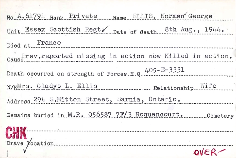Son of Herman and Annie Ellis, of Sarnia, Ontario; husband of Gladys Louise Ellis, of Sarnia.
