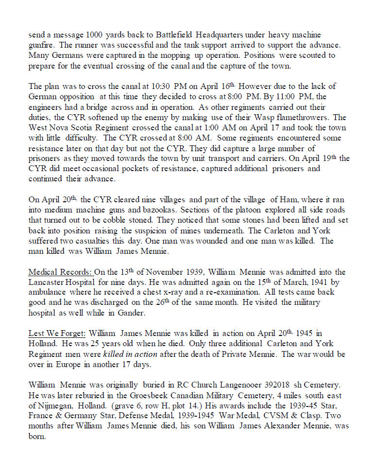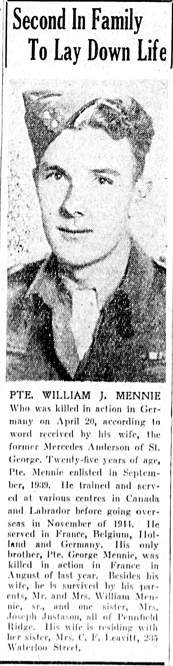 Son of William and Jessie Mennie of Pennefield Ridge, New Brunswick. Husband of Mercedes C. Mennie of Pennfield Ridge, New Brunswick.