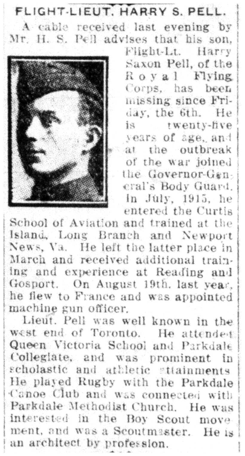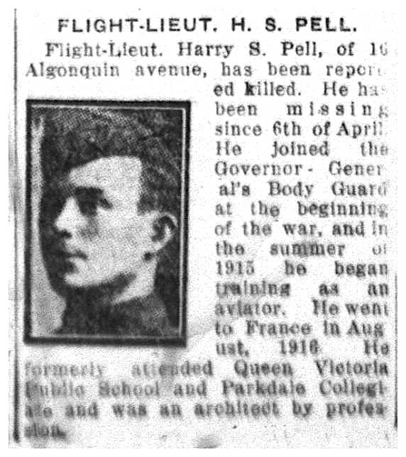 Second Lieutenant Pell went to Queen Victoria Public School, and Parkdale Collegiate Institute and ultimately graduated as an architect.