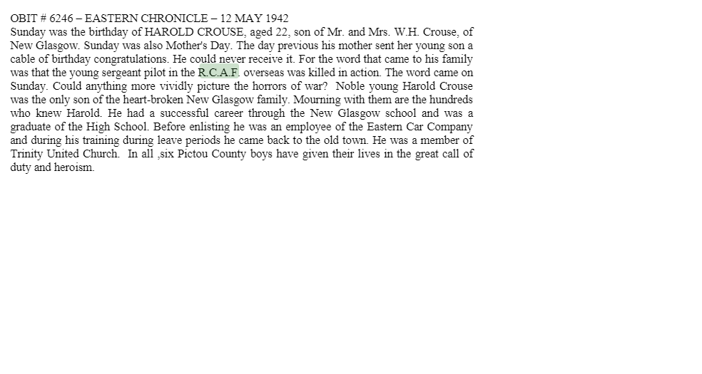 Son of William Banford Crouse and Edith L. Crouse, of Pictou Landing, Nova Scotia, Canada.