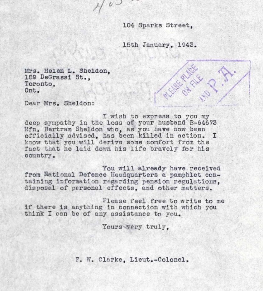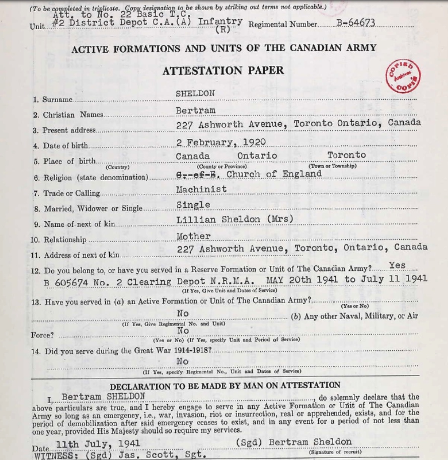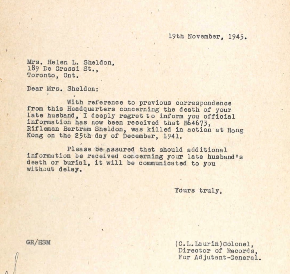 Bertram served with the 10th Basic Training Camp in Kitchener, Ontario, from 11 to 25 July 1941, with the Queen’s Own Rifles of Canada, Ontario, from 25 July 1941 to 18 October 1941, with the 1st Battalion, Royal Rifles of Canada, from 19 October 1941 until his death in Hong Kong with Force C. He had 168 days of service, including 59 overseas.