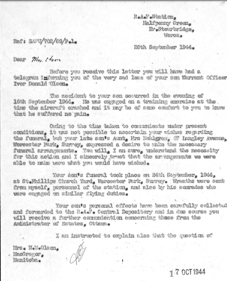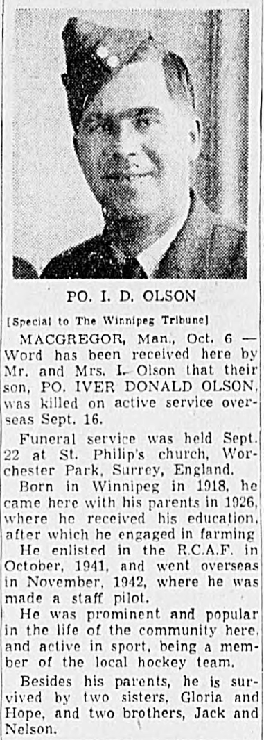 Son of Andrew Ivor and Nellie Matilda Olsen, of MacGregor, Manitoba.