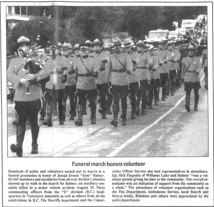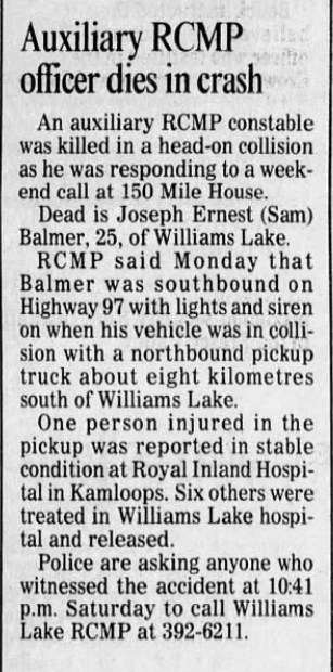 A/Cst. Balmer was born in Surrey, British Columbia and was known as "Sam". He had a variety of interests including: hiking and camping, gardening with his family. At school he played basketball, volleyball, and was on track team. A/Cst. Balmer joined the Kinsmen club and worked on several of their committees. At the time of his death, A/Cst. Balmer was in the application process of becoming a regular member. A/Cst. Balmer was a passenger in a police vehicle that was responding to a domestic dispute. A/Cst. Balmer was married to Gwen and they had a son, Brandon.