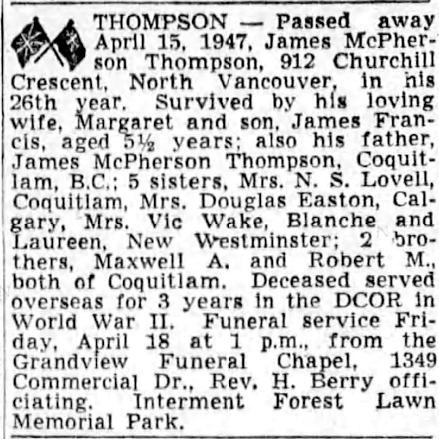 Son of Mr. and Mrs. J. M. P. Thompson, of Port Coquitlam; husband of Margaret D. Thompson, of North Vancouver.