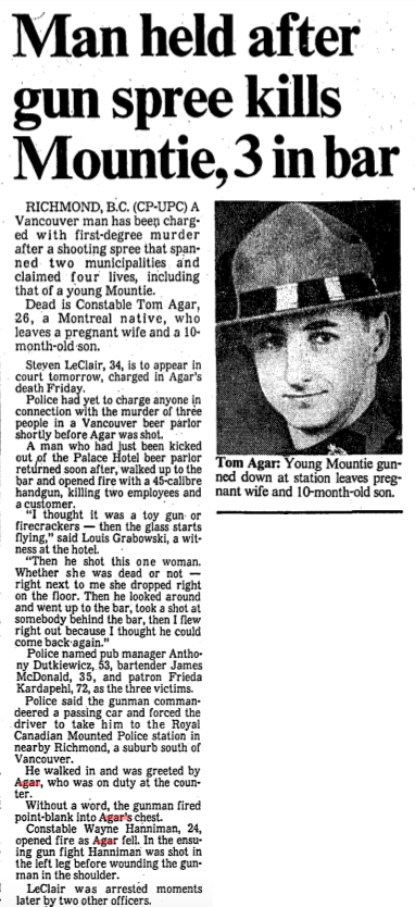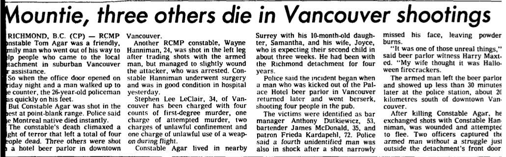 Cst. Agar was born in Montreal, Quebec. He was working light duties in the detachment when he was shot. Cst. Agar was married to Joyce who was pregnant at the time of his death. The couple had a young daughter named Samantha. At Depot there is an “Agar Lane” in memory of Cst. Agar. He is buried in Ocean View Cemetery in Burnaby, BC.