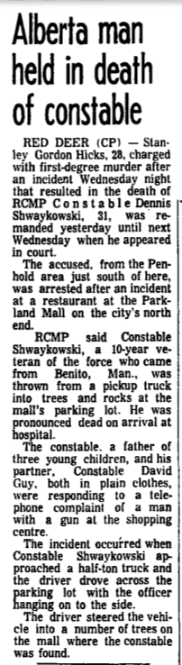 Cst. Shwaykowski was the first police officer ever to die in the line of duty in the City of Red Deer. He was killed after being thrown from a moving vehicle while trying to apprehend an armed man. Cst. Shwaykowski was married to Linda and they had 3 children. He is buried in Birchwood Cemetery at Swan River, Manitoba.