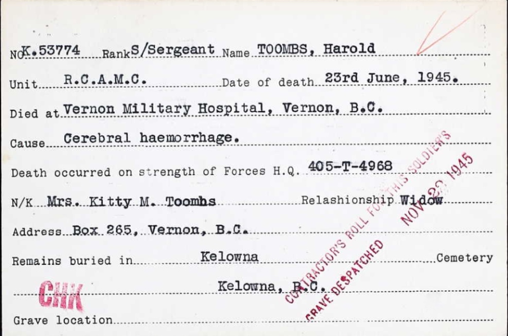 Son of Mrs. E. Toombs, of Salmon Arm; husband of Kitty M. Toombs, of Vernon.