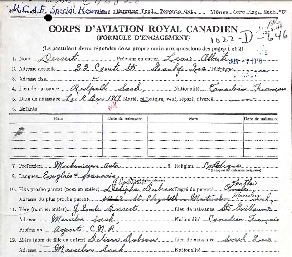 Son of Joseph Emile and Delisca Dessert, of Marcelin, Saskatchewan. Husband of Irene Dessert, of New Westminster, British Columbia.