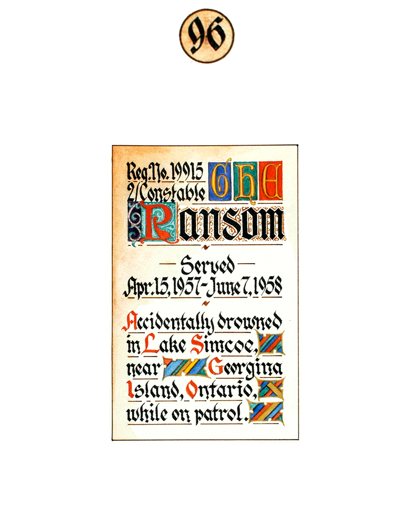 2/Cst. Ransom was awarded the Royal Life Saving Society for swimming and lifesaving ability. He accidentally drowned while on patrol in Lake Simcoe, near Georgina Island, Ontario. At the time of his death 2/Cst. Ransom was posted to the Divisional Headquarters in Toronto. He was engaged to Elaine Williams and buried in Melville, Saskatchewan.