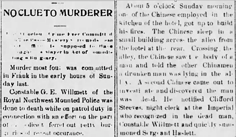 Constable Willmett was originally a house painter and came to Canada in early 1907. He was murdered by a burglar while on night patrol in the town of Frank, Alberta. It took over three years of undercover work to find out who was responsible. Constable Willmett is buried in the Union Cemetery, Fort MacLeod, Alberta.