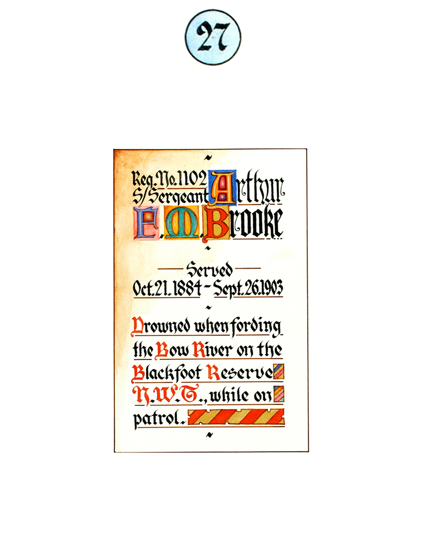 Staff Sergeant Brooke was a Mason. He joined the NWMP the same day as his brother, A.R. Brooke. He was promoted to corporal June 1, 1888, to sergeant July 14, 1890 and to staff sergeant January 1, 1893. Staff Sergeant Brooke was very well and favourably known throughout the district. He drowned on patrol when fording the Bow River on the Blackfoot Reserve, Northwest Territories. He had a wife Margaret, and two children Annie and Arthur. His wife never remarried and died in 1950.