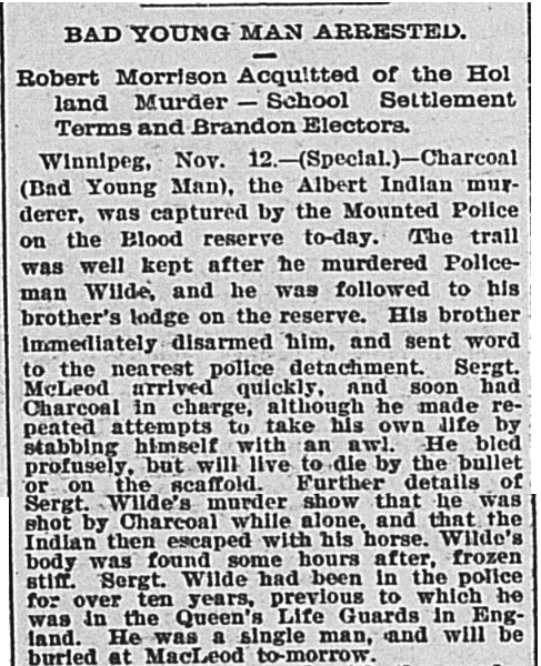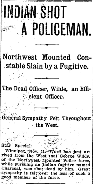 Sergeant Wilde was a member of the Royal Irish Dragon Guards before coming to Canada. He was killed while attempting to arrest a fugitive near Dry Forks, Kootenai River, Northwest Territories.