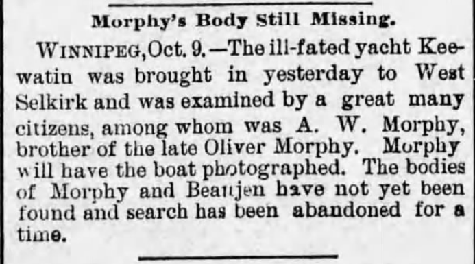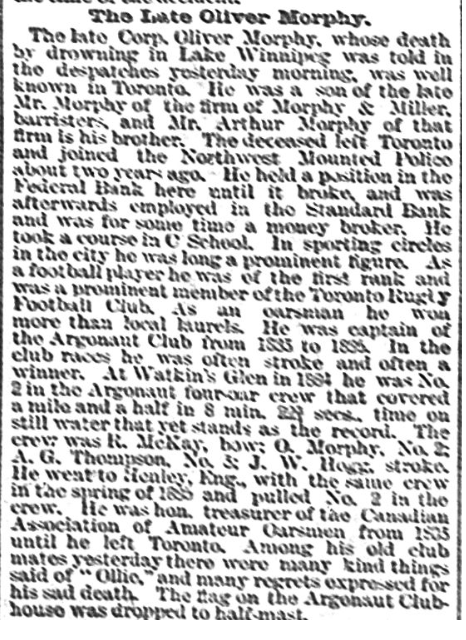 Corporal Morphy was formerly a law student and clerk with the Federal Bank in Toronto. He was an accomplished athlete who captained the Toronto Rugby Union Football Club and oared competitively with the Argonaut Rowing Club. He was promoted to Corporal in February 1889. Corporal Morphy drowned in Lake Winnipeg when the Mounted Police boat capsized during a storm.