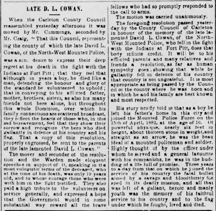 Constable Cowan was originally from Ottawa. He was killed at Fort Pitt, Northwest Territories, while on scouting duty. His North West Canada Medal (1885) and Clasp were donated to the RCMP Museum. Constable Cowan is buried in Frog Lake, Alberta.