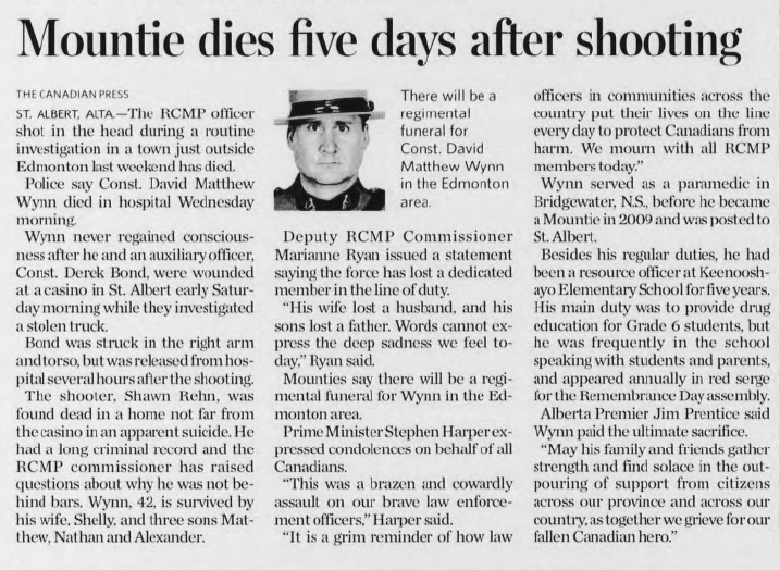 Cst. Wynn was originally from Newcastle, New Brunswick. He was posted to St. Albert Detachment in Alberta upon graduation from Depot. He died from a gunshot wound sustained while attempting to apprehend a suspect in a stolen vehicle investigation on January 21, 2015 in St. Albert, Alberta.