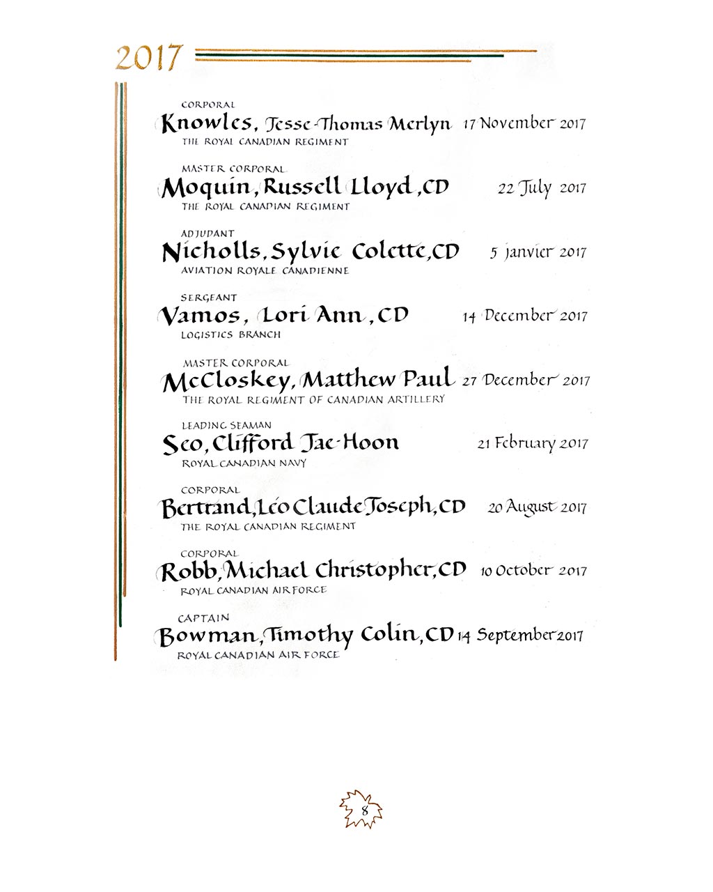 Page 8 of the In the Service of Canada, Vol. II (2015 – ) Book of Remembrance.