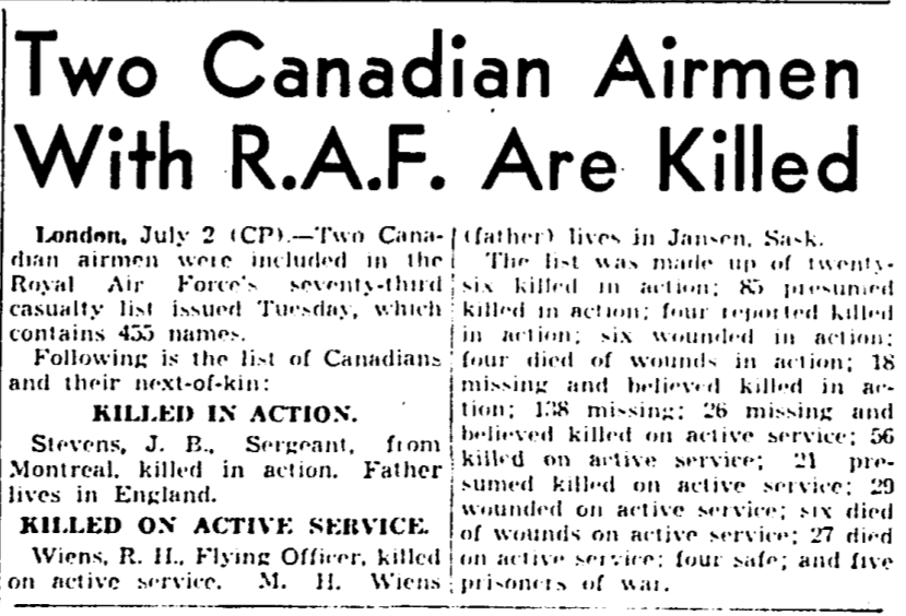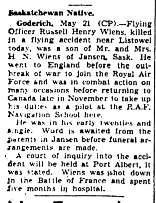 Son of Henry and Mary Wiens, of Jansen, Saskatchewan.