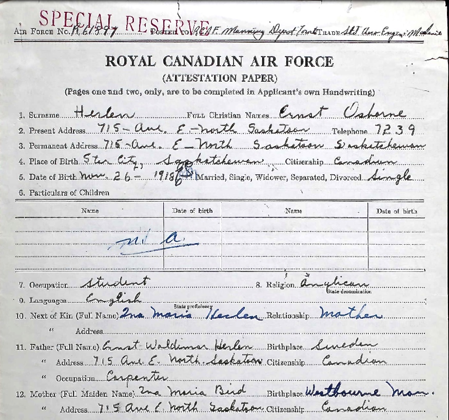 Son of Ernest Waldemar Herlen and Ina Maria Herlen, of Saskatoon, husband of Alice Mabel Herlen, of Saskatoon.