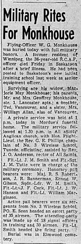 Son of Geoffrey and Agusta Monkhouse, of Winnipeg husband of Marjorie May Monkhouse, of Winnipeg.