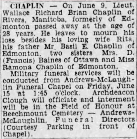 Son of Basil and the late Mary (nee Summer) Chaplin of Edmonton, Alberta. Husband of Therise Rita Lucienne (née Loiselle) Chaplin of Rivers, Manitoba. Brother of Frances and Ramona.