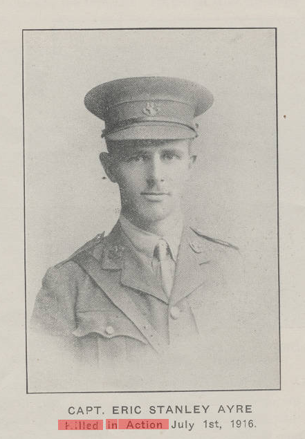 Brother of Captain Bernard Pitts Ayre who died on July 1, 1916 while serving with the Norfolk Regiment (British Expeditionary Force).