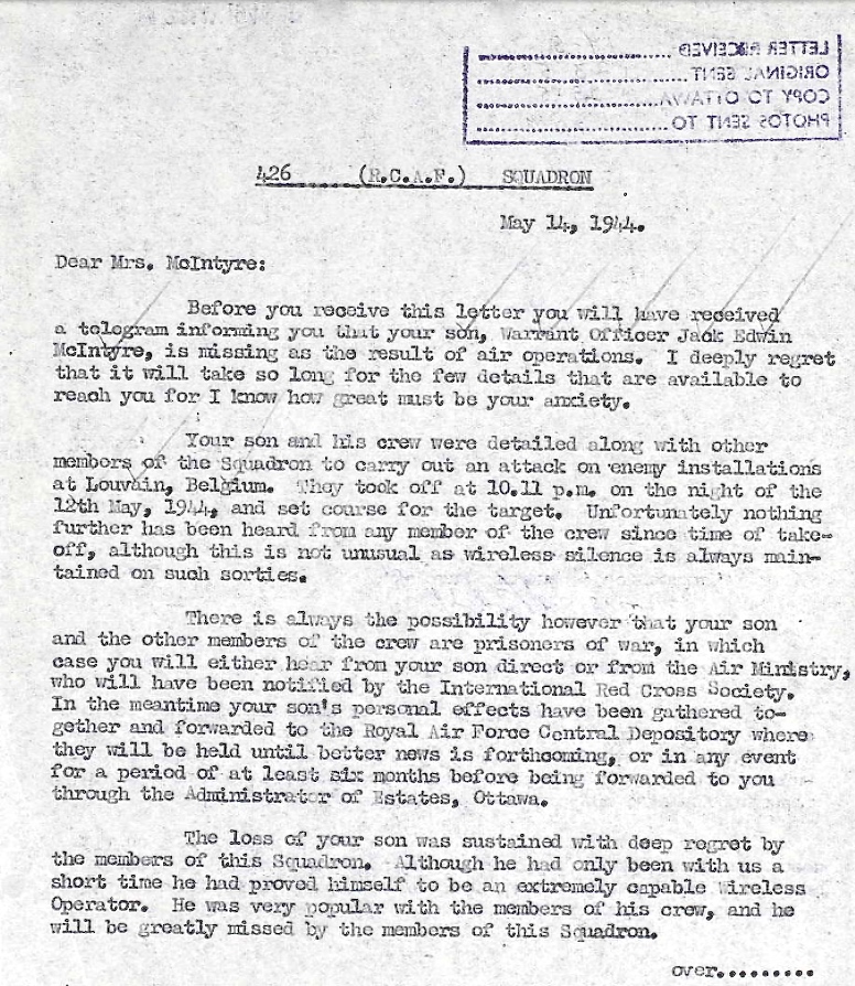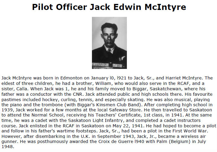 Son of John L. and Harriet McIntyre. The eldest of three children, he had a brother, William, who would also serve in the RCAF, and a sister, Calla. When Jack was one year old, he and his family moved to Biggar, Saskatchewan, where his father was a conductor with the CNR. Jack attended public and high schools there. His favourite pastimes included hockey, curling, tennis, and especially skating. He was also musical, playing the piano and the trombone (with Biggar's Kinsmen Club Band). After completing high school in 1939, Jack worked for a few months at the local Safeway Store. He then travelled to Saskatoon to attend the Normal School, receiving his Teachers' Certificate, 1st class, in 1941. At the same time, he was a cadet with the Saskatoon Light Infantry, and completed a cadet instructors course.