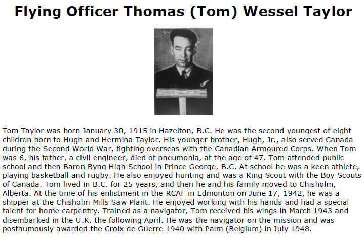 At the time of his enlistment in the RCAF in Edmonton on June 17, 1942, he was a shipper at the Chisholm Mills Saw Plant. He enjoyed working with his hands and had a special talent for home carpentry. Trained as a navigator, Tom received his wings in March 1943 and disembarked in the U.K. the following April. He was the navigator on the mission and was posthumously awarded the Croix de Guerre 1940 with Palm (Belgium) in July 1948.